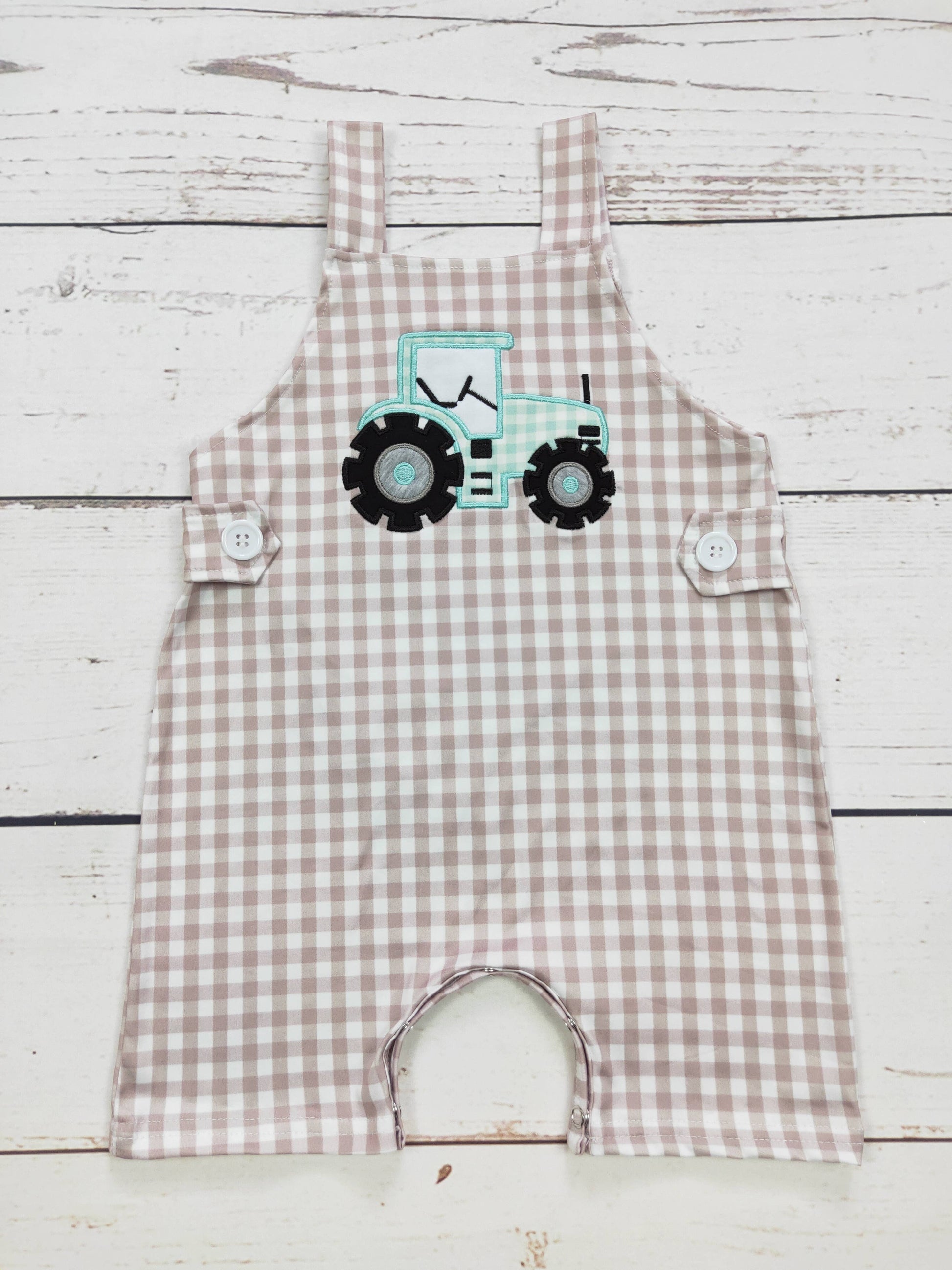Baby Boy Tractor Appliqué Checkered Romper. From the breathable fabric to the trendy appliqué design, this checked romper combines both fashion and functionality for your little one. you can have it just in time for your baby's next special occasion. Material is polyester