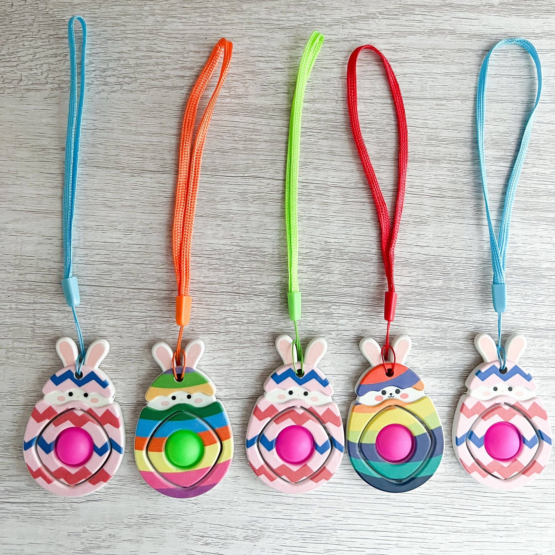 Peek-a-boo Bunny! These brightly colored hatching bunny eggs are randomly sent! Keep them all for yourself or share with your friends! A single central pop and an interior spin will keep your hands busy! Each piece comes with a bright loop holder.