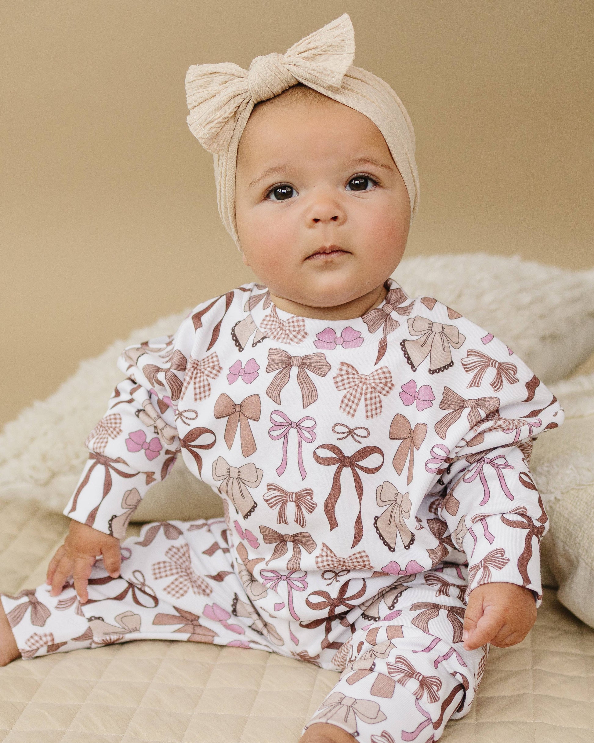 The Mocha Bows | Jogger Set is crafted from soft, breathable cotton, combining everyday comfort with effortless style. Featuring a relaxed fit, this set is perfect for playdates, lounging, and casual outings. The warm mocha tone reflects the cozy feel of fall, while the bow detail adds a sweet and stylish touch. A versatile staple that feels as good as it looks, ideal for autumn days and seasonal memories.