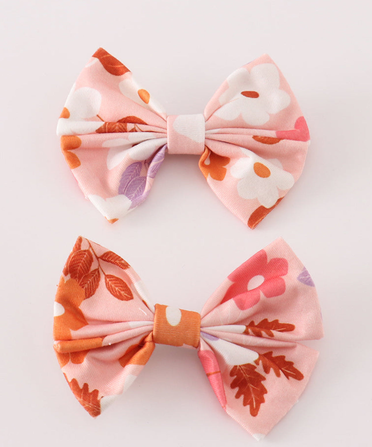 Add some spooktacular style to your hair with pumpkin floral print 2 pc hair bow! This playful hair accessory features a fun pumpkin print that is perfect for the fall season. The 2 pc set allows for endless styling options, making it a must-have addition to your collection.