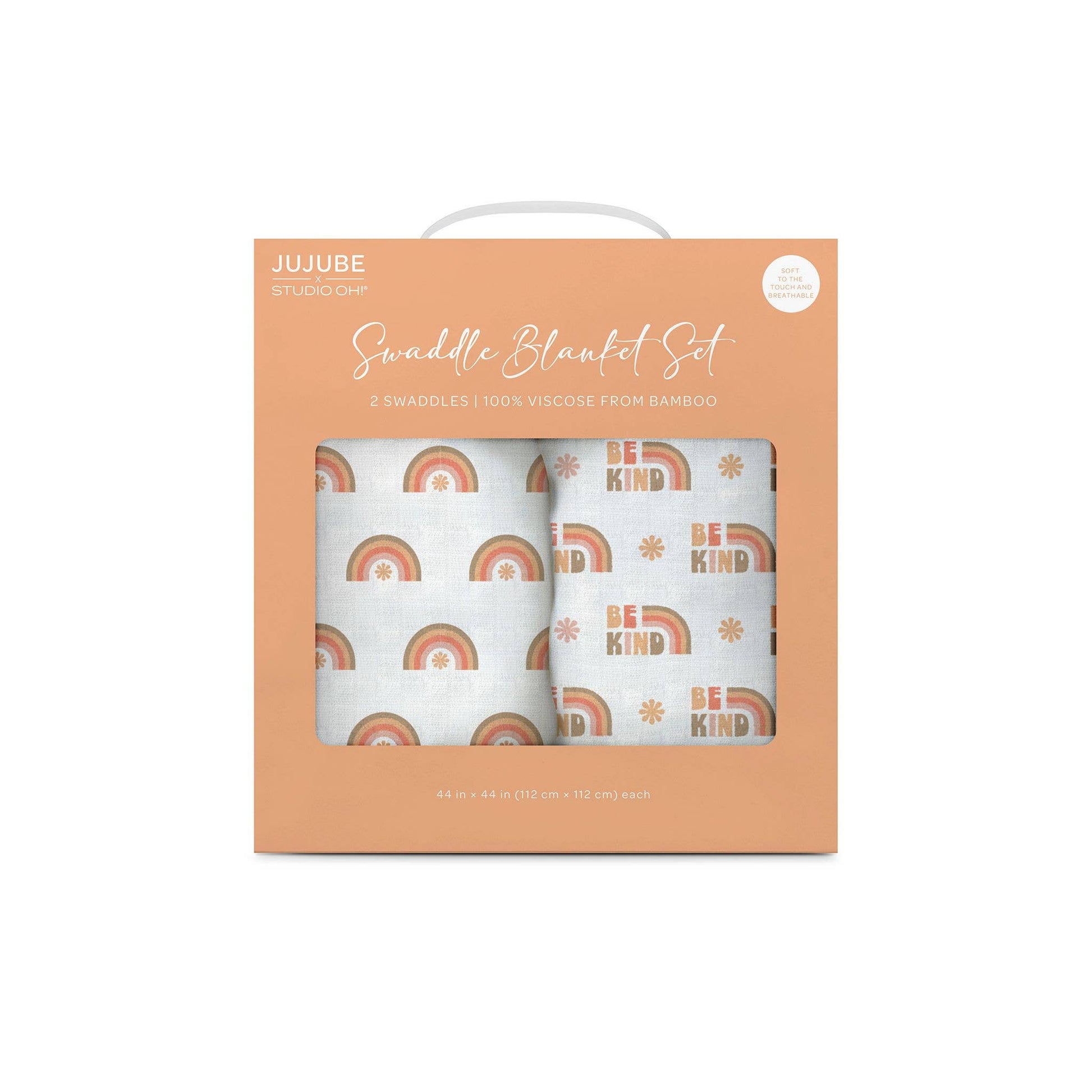 The Swaddle Blanket Set from JuJuBe × Studio Oh! includes two blankets, each with an irresistible, on-trend design. While perfect for swaddling newborns, these blankets can also be used for tummy time, as lightweight stroller covers, and as nursing throws. Each measures 44 by 44 inches (112 cm × 112 cm) and is made of sustainable, non-GMO bamboo fabric that is gentle and soft on Baby’s skin. Designed with sweet artwork in nursery-friendly colors, these blankets come packaged in a giftable box, making them a perfect surprise for new parents and moms-to-be. Two swaddle blankets measuring 44"W × 44"L (112 cm × 112 cm) each 100% viscose from bamboo; produced using non-GMO, sustainable plants Machine washable