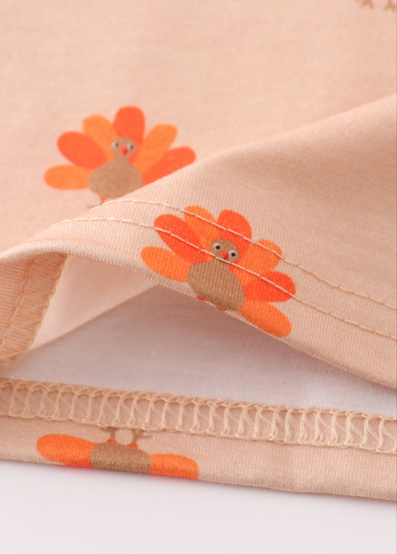 Get ready for a gobble good time with these turkey print pj’s. Comfortable pajamas featuring a playful turkey print. Perfect for Thanksgiving fun! Let your little one show off their unique style with this fun and quirky sleepwear set.